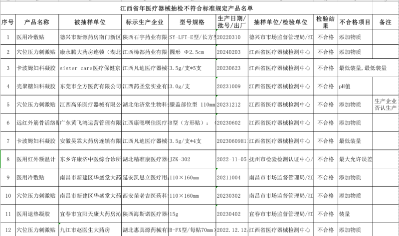 近日,江西省藥監(jiān)局發(fā)布公告稱,該局持續(xù)對本省醫(yī)療器械生產(chǎn)、經(jīng)營和使用環(huán)節(jié)實施了監(jiān)督抽樣檢驗,共有12批次產(chǎn)品不符合標準規(guī)定,涉及醫(yī)用冷敷貼、穴位壓力剌激貼、卡波姆婦科凝膠、殼聚糖婦科凝膠等產(chǎn)品,多款產(chǎn)品不合格項目為“添加物質(zhì)”,具體明細如下: