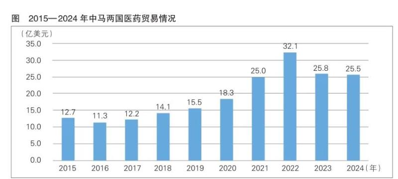 據(jù)中國海關(guān)統(tǒng)計數(shù)據(jù),中馬兩國醫(yī)藥貿(mào)易額由2015年的12.7億美元,增長至2024年的25.5億美元(詳見下圖),10年間復(fù)合增長率為7.22%,總體保持增長態(tài)勢。