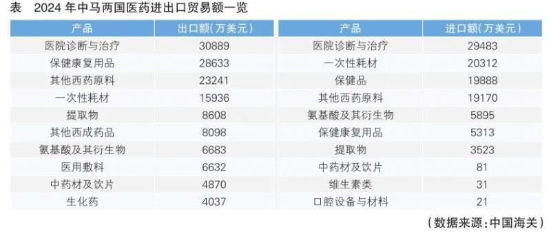 中馬兩國在疫苗、醫(yī)院診斷與治療、保健康復(fù)等醫(yī)藥產(chǎn)品中的合作進一步深化。2024年,醫(yī)院診斷與治療產(chǎn)品貿(mào)易額較高,約為6.04億美元,其他西藥原料、一次性耗材等產(chǎn)品貿(mào)易額均超過1億美元(詳見表)。