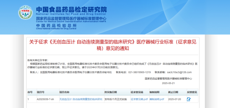 近日,國家藥監(jiān)局醫(yī)療器械標準管理中心發(fā)布《無創(chuàng)血壓計 自動連續(xù)測量型的臨床研究》醫(yī)療器械行業(yè)標準(征求意見稿),并向社會公開征求意見。