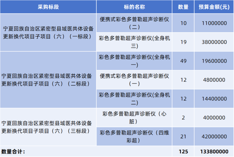 據(jù)了解,本次采購項目分為三個標段,總預算達 1.338 億元,涉及 125 臺彩色多普勒超聲診斷儀,涵蓋便攜式、全身機、心臟以及四維彩超。