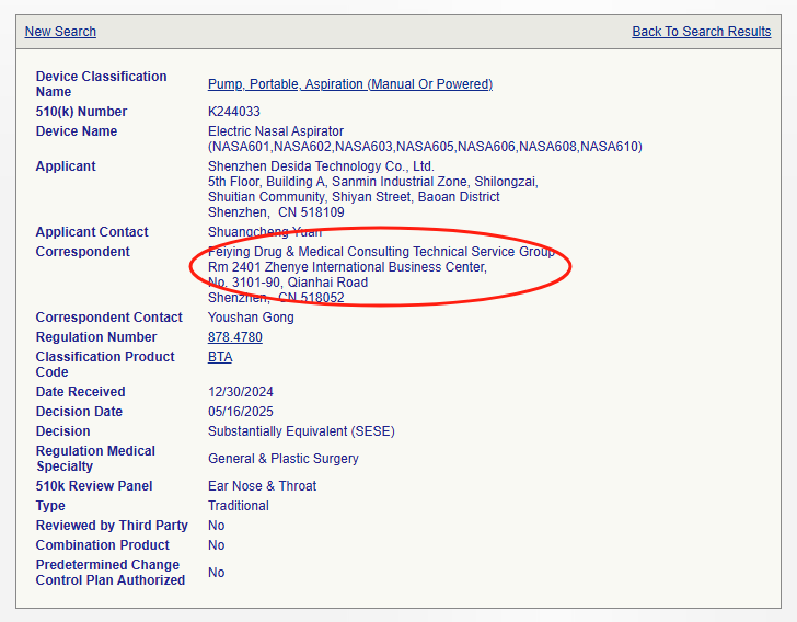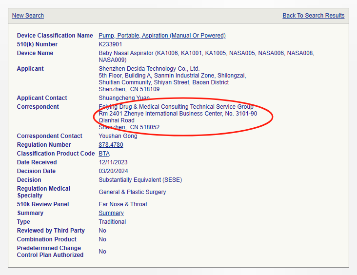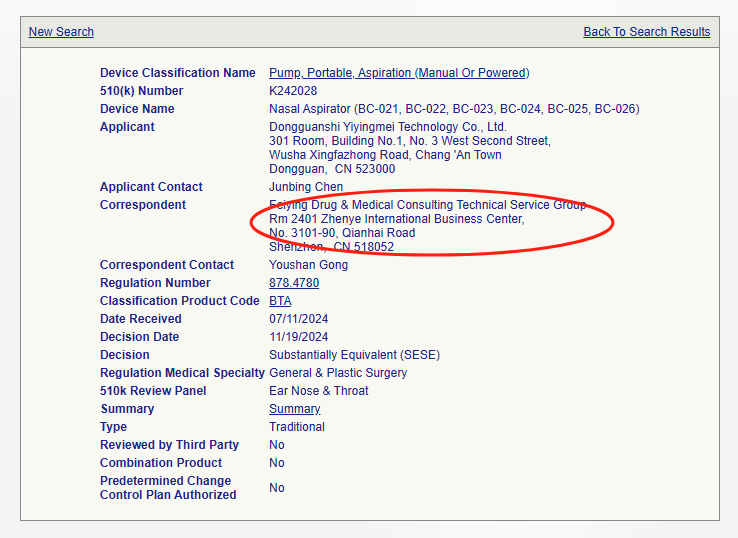 我們在FDA 510(k)數(shù)據(jù)庫用產(chǎn)品代碼BTA進行檢索,近兩年來由金飛鷹申報并作為官方Correspondent的有如下企業(yè)的吸鼻器產(chǎn)品: