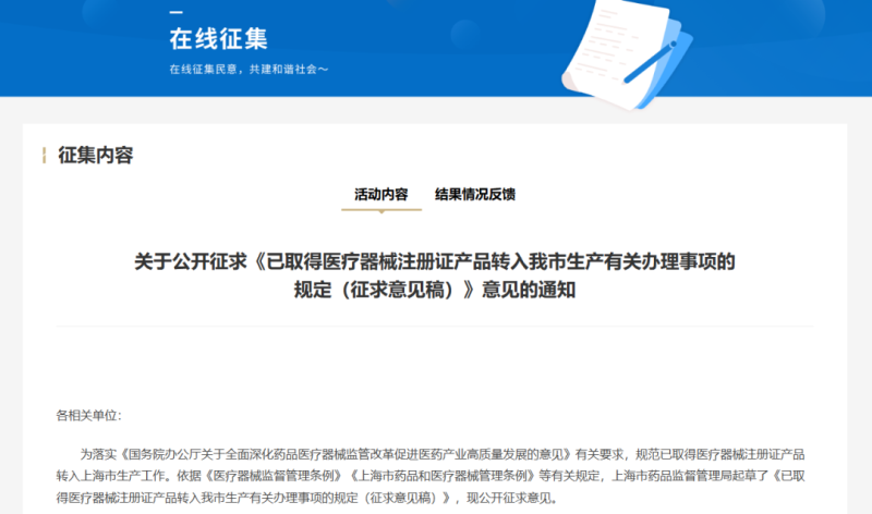 近日,上海市藥監(jiān)局發(fā)布《已取得醫(yī)療器械注冊證產品轉入我市生產有關辦理事項的規(guī)定》(以下簡稱《規(guī)定》),并向社會公開征求意見。
