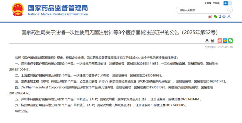 近日,國家藥監(jiān)局發(fā)布一則醫(yī)療器械注冊(cè)證注銷公告,公告顯示,該局已依法注銷深圳市保安醫(yī)療用品有限公司、深圳市科曼醫(yī)療設(shè)備有限公司等6家企業(yè)共計(jì)8個(gè)產(chǎn)品的醫(yī)療器械注冊(cè)證,包括一次性使用無菌注射針、一次性使用等離子手術(shù)電極、黃疸治療儀等產(chǎn)品,具體如下: