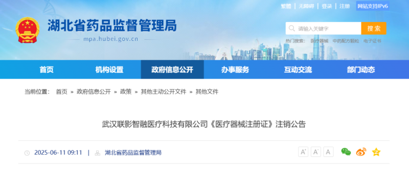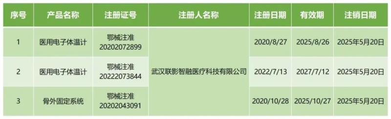 6月11日,湖北省藥監(jiān)局發(fā)布三則《醫(yī)療器械注冊證》注銷公告,我們通過查看公告內容發(fā)現(xiàn),被注銷的注冊證均來自同一家公司——武漢聯(lián)影智融醫(yī)療科技有限公司,產品包括醫(yī)用電子體溫計及骨外固定系統(tǒng),以下為具體明細: