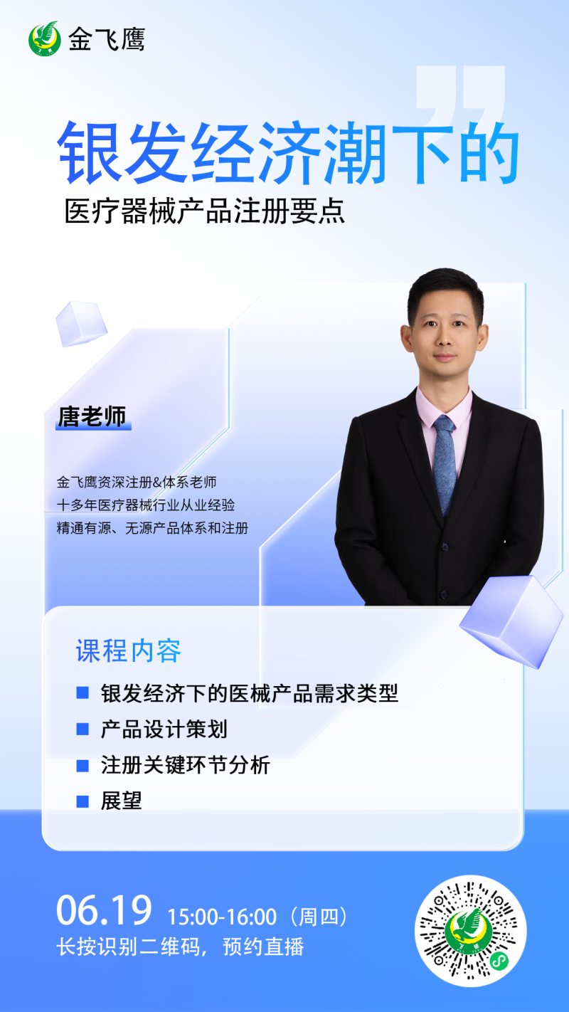 6月19日下午3點(diǎn),有著十多年醫(yī)療器械行業(yè)從業(yè)經(jīng)驗(yàn)、精通醫(yī)療器械產(chǎn)品注冊(cè)及體系輔導(dǎo)的唐老師給大家?guī)怼?/span>銀發(fā)經(jīng)濟(jì)浪潮下的醫(yī)療器械注冊(cè)要點(diǎn)》,感興趣的朋友記得提前預(yù)約,與我們一起解鎖“銀發(fā)經(jīng)濟(jì)”產(chǎn)品注冊(cè)全流程優(yōu)化方案~