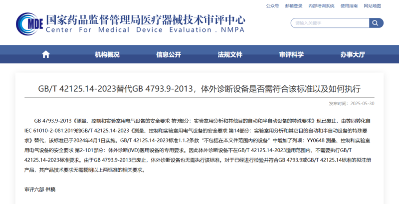 如題,根據(jù)國(guó)家藥監(jiān)局器審中心的答復(fù),GB 4793.9-2013《測(cè)量、控制和實(shí)驗(yàn)室用電氣設(shè)備的安全要求 第9部分:實(shí)驗(yàn)室用分析和其他目的自動(dòng)和半自動(dòng)設(shè)備的特殊要求》現(xiàn)已廢止,由等同轉(zhuǎn)化自IEC 61010-2-081:2019的GB/T 42125.14-2023《測(cè)量、控制和實(shí)驗(yàn)室用電氣設(shè)備的安全要求 第14部分:實(shí)驗(yàn)室用分析和其它目的自動(dòng)和半自動(dòng)設(shè)備的特殊要求》替代,該標(biāo)準(zhǔn)已于2024年4月1日起實(shí)施。