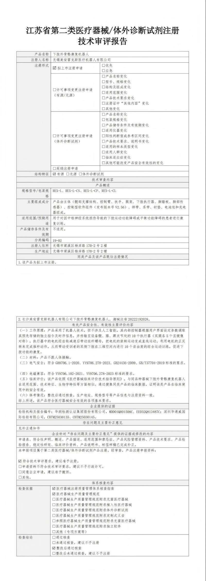 近日,江蘇省藥監(jiān)局公布了2025年5月批準(zhǔn)注冊的磁刺激治療儀、重組膠原蛋白液體敷料、生命體征檢測儀、一次性使用無菌皮膚滾針、短波治療儀、艾灸儀、醫(yī)用透明質(zhì)酸鈉凝膠敷料、下肢外骨骼康復(fù)機(jī)器人等164個(gè)醫(yī)療器械產(chǎn)品目錄,同時(shí)隨附了所有產(chǎn)品的技術(shù)審評報(bào)告,我們其中“下肢外骨骼康復(fù)機(jī)器人”(預(yù)期用途:用于對因中樞神經(jīng)系統(tǒng)損傷導(dǎo)致的下肢運(yùn)動(dòng)功能障礙或平衡功能障礙的患者進(jìn)行康復(fù)訓(xùn)練)的技術(shù)審評報(bào)告以圖片形式轉(zhuǎn)載如下: