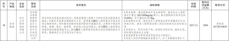 近日,四川省經(jīng)濟(jì)和信息化廳發(fā)布《關(guān)于開展2025年第三批企業(yè)找技術(shù)“雙向揭榜掛帥”項(xiàng)目申報工作的通知》(以下簡稱《通知》),對應(yīng)2025年第三批企業(yè)找技術(shù)“雙向揭榜掛帥”榜單的20家發(fā)榜企業(yè)的技術(shù)需求,公開征集解決方案。本次涉及人工智能、航空航天、高端能源設(shè)備、低空經(jīng)濟(jì)、新能源汽車及動力電池、軟件和信息服務(wù)、醫(yī)藥健康、農(nóng)產(chǎn)品精深加工8個產(chǎn)業(yè)領(lǐng)域,其中有一個醫(yī)藥健康領(lǐng)域項(xiàng)目——“醫(yī)用高活性修復(fù)新材料重組全長人膠原蛋白產(chǎn)業(yè)化技術(shù)攻關(guān)及應(yīng)用”,具體明細(xì)如下: