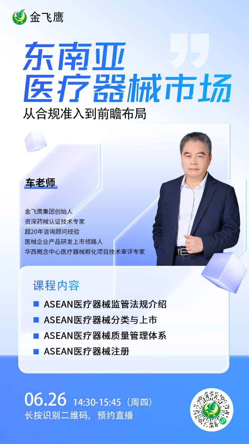金飛鷹直播培訓(xùn),是每周一次的固定培訓(xùn)欄目,優(yōu)選金飛鷹國(guó)內(nèi)外資深注冊(cè)/項(xiàng)目老師定期為大家講解醫(yī)療器械注冊(cè)相關(guān)知識(shí),解答大家在醫(yī)療器械注冊(cè)過(guò)程中的諸多疑問(wèn)。