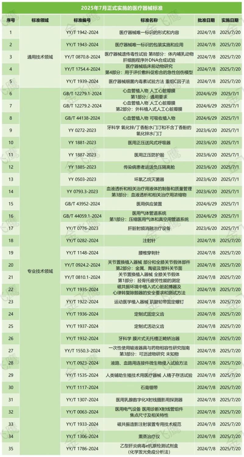根據(jù)金飛鷹匯總整理,2025年7月起正式實施的醫(yī)療器械標(biāo)準(zhǔn)共有35項,其中已于7月1日實施的有GB/T 12279.1-2024《心血管植入物 人工心臟瓣膜 第1部分:通用要求》、YY 1887-2023《醫(yī)用正壓防護(hù)服》、YY 0503-2023《環(huán)氧乙烷滅菌器》等共12項,即將于7月20日實施的有YY/T 1942-2024《醫(yī)療器械唯一標(biāo)識的形式和內(nèi)容》、YY/T 0282-2024《注射針》、YY/T 1936-2024《定制式固定義齒》等共23項,具體明細(xì)如下: