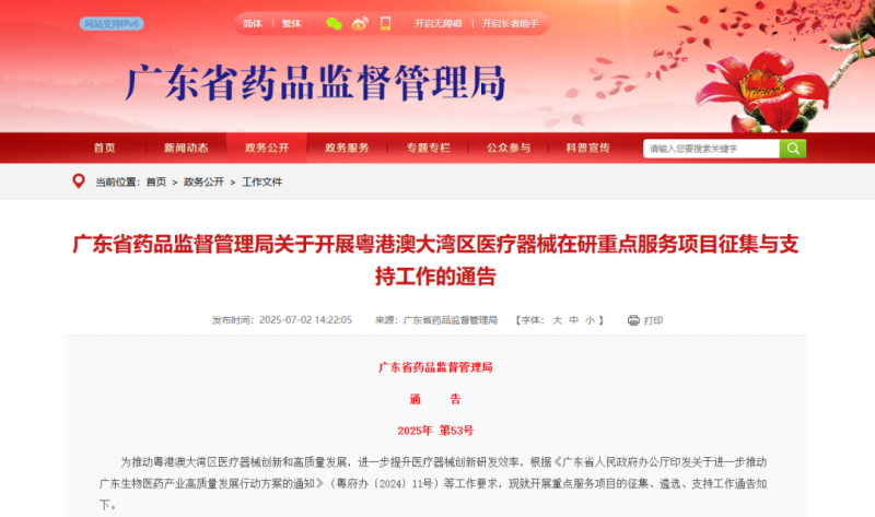 7月2日,廣東省藥監(jiān)局發(fā)布《關(guān)于開展粵港澳大灣區(qū)醫(yī)療器械在研重點(diǎn)服務(wù)項(xiàng)目征集與支持工作的通告》(以下簡稱《通告》),以推動粵港澳大灣區(qū)醫(yī)療器械創(chuàng)新和高質(zhì)量發(fā)展,進(jìn)一步提升醫(yī)療器械創(chuàng)新研發(fā)效率。《通告》正文內(nèi)容如下: