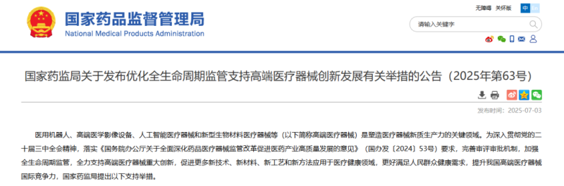 7月3日,國家藥監(jiān)局發(fā)布《關(guān)于發(fā)布優(yōu)化全生命周期監(jiān)管支持高端醫(yī)療器械創(chuàng)新發(fā)展有關(guān)舉措的公告》(以下簡稱《公告》),針對(duì)醫(yī)用機(jī)器人、高端醫(yī)學(xué)影像設(shè)備、人工智能醫(yī)療器械和新型生物材料醫(yī)療器械等(以下簡稱高端醫(yī)療器械),提出優(yōu)化特殊審批程序、完善分類和命名規(guī)則、持續(xù)健全標(biāo)準(zhǔn)體系等十方面支持舉措。