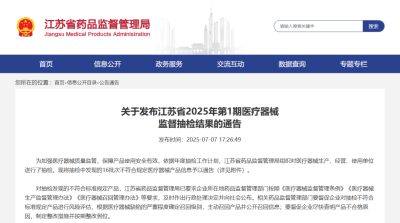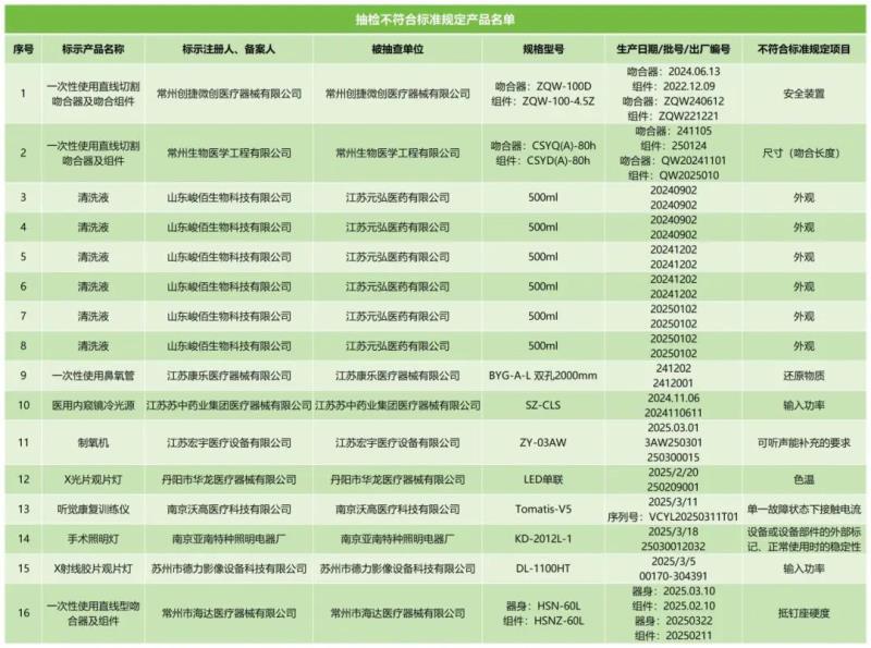 近日,江蘇省藥監(jiān)局發(fā)布《江蘇省2025年第1期醫(yī)療器械監(jiān)督抽檢結(jié)果的通告》,共通告了一次性使用直線切割吻合器及吻合組件、一次性使用鼻氧管、制氧機、聽覺康復(fù)訓練儀等16批次不符合規(guī)定醫(yī)療器械產(chǎn)品,具體明細如下: