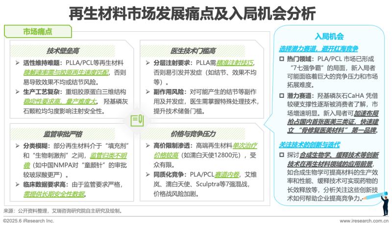 再生材料市場正面臨著技術壁壘高、醫(yī)生技術門檻高、監(jiān)管審批嚴格以及價格與競爭壓力大的多重挑戰(zhàn)。然而,市場痛點背后也蘊藏著入局機會。新入局者可選擇潛力賽道,避開紅海競爭,如羥基磷灰石CaHA憑借其較硬支撐性逐漸被消費者了解,市場增長迅速,新入局者可加速布局,搶占國內尚未有三類證的先機,快速建立品牌優(yōu)勢。同時,要關注技術的創(chuàng)新與迭代,比如合成生物學可提高材料的生產效率和性能,緩釋技術可實現藥物的長效釋放等,深入分析這些創(chuàng)新技術在再生材料領域的應用前景,助力企業(yè)提高競爭力,從而在再生材料市場中尋得發(fā)展新路徑。