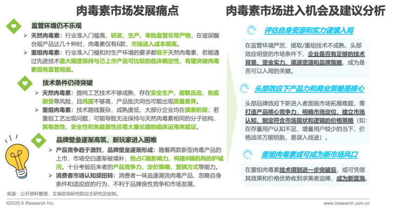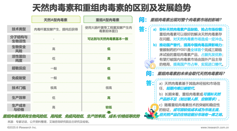 天然肉毒素是從肉毒桿菌培養(yǎng)液中提取的神經毒素,含有毒素蛋白及輔助蛋白,臨床應用歷史悠久,但可能存在批次差異和雜質風險。重組肉毒素通過基因工程生產,僅含純化毒素蛋白,純度高、穩(wěn)定性強,并可定制化調整效力或持久性。未來,重組肉毒素有望憑借安全性和可設計性逐步滲透醫(yī)美市場,但短期內天然產品仍占主導。長期來看,兩者可能共存——重組產品側重高純度、個性化需求,而天然產品依賴品牌信任和成熟應用。技術進步和成本優(yōu)化將是重組肉毒素能否顛覆市場的關鍵。