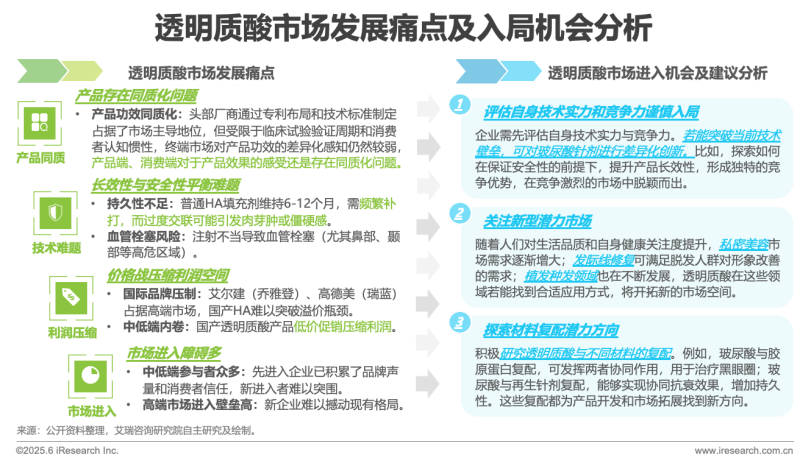 中國透明質酸行業(yè)近年來經歷了顯著的增長,這一趨勢得益于市場需求的不斷擴大以及應用領域的持續(xù)拓展。然而,在這一高速增長的背后,行業(yè)也面臨著產品同質化、長效性與安全性平衡難題、價格戰(zhàn)和市場進入障礙等痛點。盡管如此,行業(yè)的發(fā)展并非沒有機遇。技術創(chuàng)新是實現產品差異化的關鍵,企業(yè)可以通過研發(fā)新技術、改進生產工藝等方式,提升產品的競爭力。企業(yè)若能評估自身技術實力實現差異化創(chuàng)新,關注私密美容等新型潛力市場,探索與膠原蛋白等材料復配的潛力方向,也能在競爭中尋得入局發(fā)展的機會。