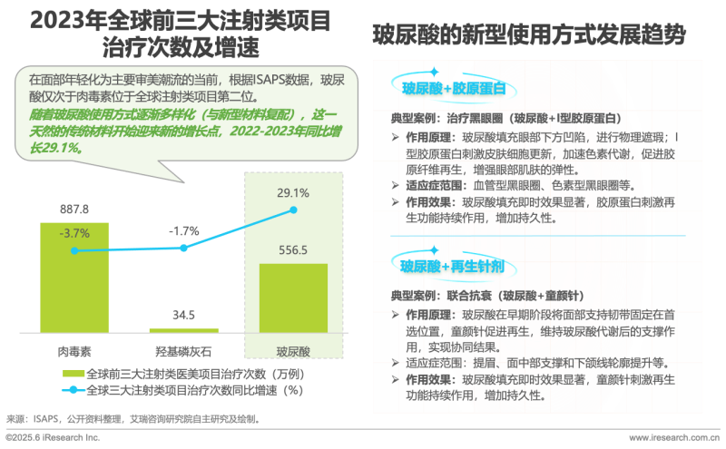 隨著醫(yī)美上游材料的多樣化,玻尿酸作為“頂流”的地位是否會受到沖擊一直是行業(yè)內熱議的話題。根據ISAPS數據,2023年全球注射類項目排名中,玻尿酸僅次于肉毒素位居第二。但隨著玻尿酸的復配方式多樣化、聯合治療手段越來越成熟,其應用邊界被不斷拓寬,2022-2023年增速遠超肉毒素達29.1%,似乎迎來了它的“第二增長曲線”。