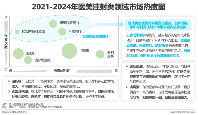 技術的進步推動著上游原料的擴產和材料的多樣化、安全化和同源化,ECM等各種新型材料不斷出現,以重組膠原蛋白、再生材料等為首的合成再生生物材料成為醫(yī)美機構投資重點。根據IT桔子數據,2024年包括泰美瑞、圣至潤和等在內的再生生物材料領域的企業(yè)紛紛融資,投資事件約占總注射類材料投資的60%。按照審批情況來看,根據藥監(jiān)局不完全統(tǒng)計,截止到2024年11月一共有15款針劑通過審批,以玻尿酸類為主,還有幾款聚左旋乳酸、聚己內酯和肉毒素類產品。雖然玻尿酸領域近年來投資熱度一般,但其仍為注射類市場的“老字號產品”和“熱門賽道”,與各種新型材料的聯合復配也將進一步豐富產品矩陣,拓寬注射類市場邊界。