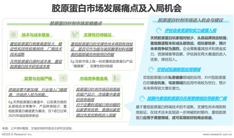 膠原蛋白作為人體內天然存在的成分,與玻尿酸一樣,對醫(yī)療美容存在著重大的意義。目前,膠原蛋白二類械市場競爭已十分火熱,但鑒于終端技術的限制,醫(yī)美針劑等三類械市場仍相對空白。隨著2025年三類械批證的增加,膠原蛋白針劑市場競爭將逐漸激烈,市場格局有望產生新的變化。由于終端技術還不夠成熟,成本困境仍未突破,相較于玻尿酸等市場,膠原蛋白針劑在醫(yī)美領域的滲透率相對較低;但鑒于其天然性、與人體的適配性,在技術突破之前,或將在美塑領域侵占較大市場份額。
