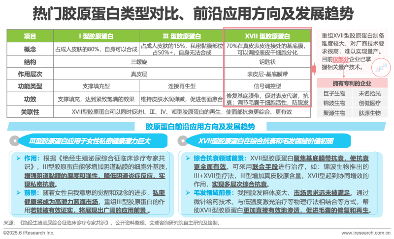 膠原蛋白按照結構和功能可以劃分為28種類型(包括I、Ⅱ、Ⅲ、Ⅳ、Ⅴ、Ⅵ、Ⅹ、XVII…),每種類型的膠原蛋白在人體中扮演著不同的角色。近年來,醫(yī)美行業(yè)應用最為廣泛的是I型和Ⅲ型膠原蛋白,起到面部支撐填充及皮膚水潤彈嫩的效果,是抗衰界的潮流產品。隨著對這兩種膠原蛋白適應癥的不斷開拓、專業(yè)玩家技術的成熟及下游消費者需求的進階,以XVII型為代表的更多類型的膠原蛋白及其多元功效被不斷發(fā)掘,終端應用場景不斷拓展,產品矩陣日漸豐富。