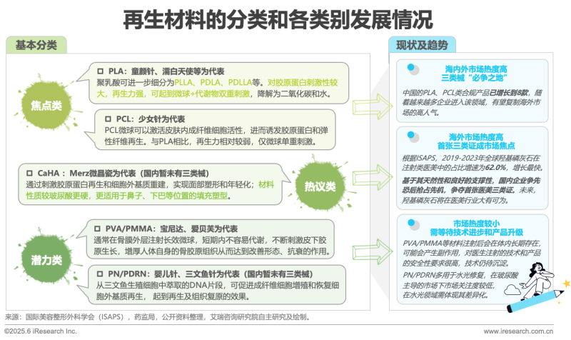 醫(yī)美再生注射類產品通常以微球的形式存在,通過刺激人體自身膠原蛋白的再生,起到填充凹陷、緊致肌膚、美容塑型的作用。醫(yī)美再生材料種類較多,近兩年市場焦點基本集中在聚乳酸(PLA)和聚己內酯(PCL)兩大類別,以童顏針、少女針為代表的一系列再生針劑賦予醫(yī)美市場更豐富的品類和更高的增速,也成為各大廠商進軍再生領域的“必爭之地”。其次,羥基磷灰石(CaHA)作為人體中天然存在的一種材料廣泛用于骨修復,它較硬的支撐性或可推動其未來在隆鼻、墊下巴等填充領域獲得較大市場份額。