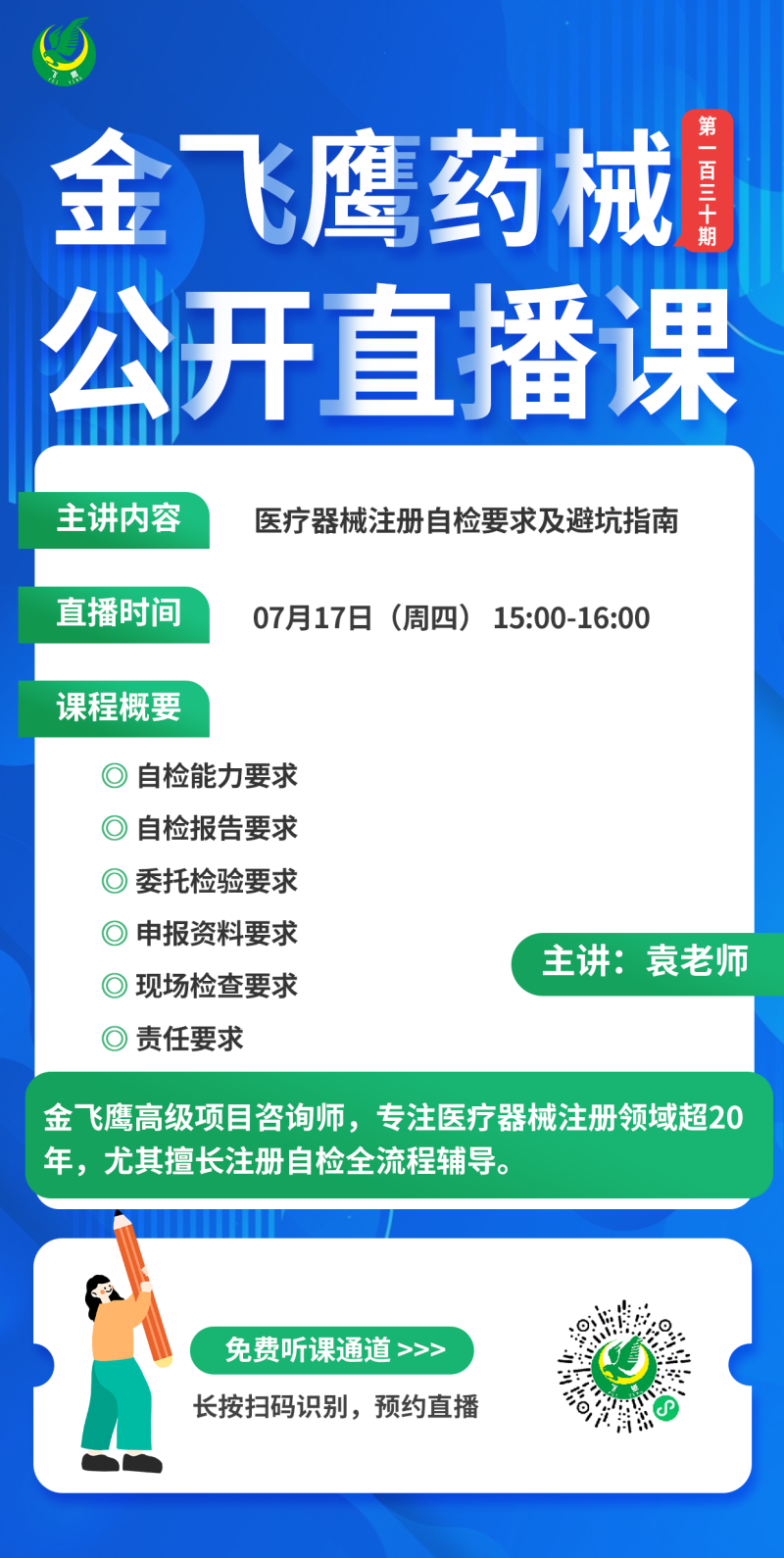 7月17日下午3點(diǎn),金飛鷹高級(jí)項(xiàng)目咨詢(xún)師,專(zhuān)注醫(yī)療器械注冊(cè)領(lǐng)域超20年,尤其擅長(zhǎng)注冊(cè)自檢全流程輔導(dǎo)的袁老師給大家?guī)?lái)《醫(yī)療器械注冊(cè)自檢要求及避坑指南》,在一一梳理注冊(cè)自檢各方面要求的同時(shí),還會(huì)結(jié)合過(guò)往的實(shí)際輔導(dǎo)案例給大家總結(jié)避坑指南及現(xiàn)場(chǎng)核查應(yīng)對(duì)策略,感興趣的朋友記得提前預(yù)約!