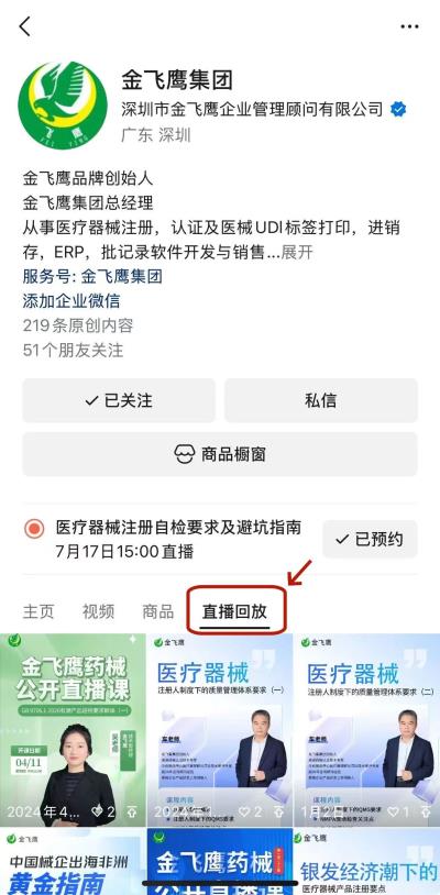 往期直播培訓(xùn)課程支持回放,關(guān)注“金飛鷹藥械咨詢(xún)服務(wù)”視頻號(hào)并點(diǎn)擊視頻號(hào)主頁(yè),即可查看“直播回放”哦~