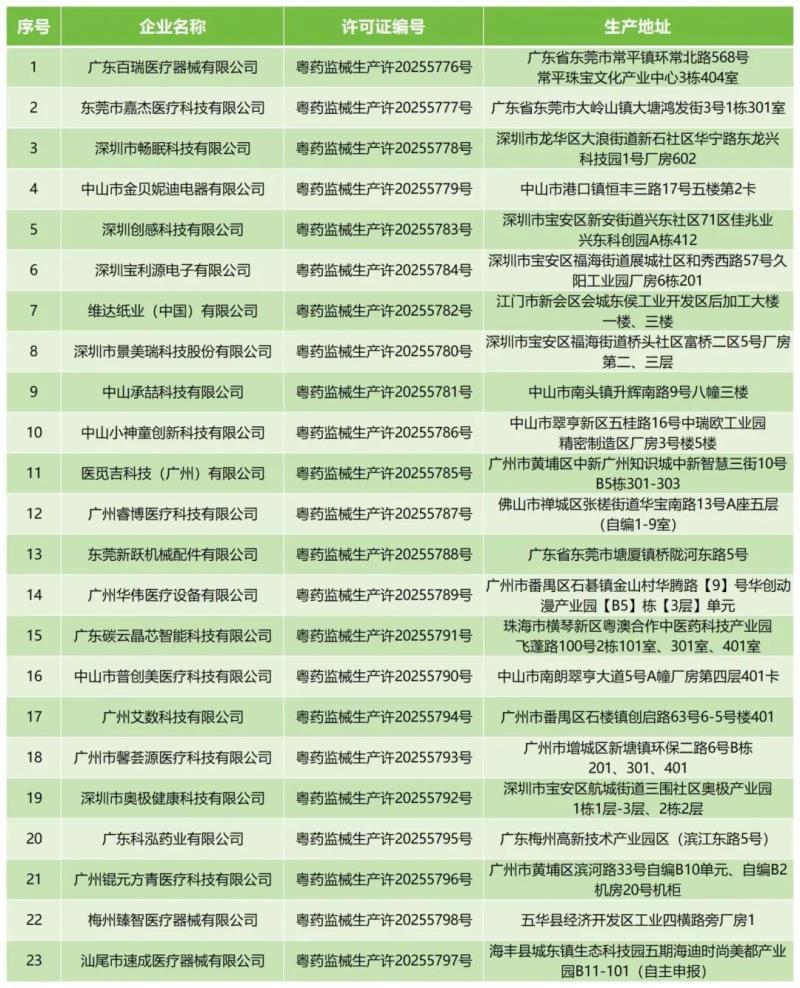 近日,廣東省藥監(jiān)局公布了《2025年6月醫(yī)療器械生產(chǎn)許可證核發(fā)清單》,據(jù)該公開數(shù)據(jù)顯示,2025年6月,廣東百瑞醫(yī)療器械有限公司、深圳市暢眠科技有限公司、維達(dá)紙業(yè)(中國)有限公司、深圳市景美瑞科技股份有限公司等共計23家企業(yè)新拿到了醫(yī)療器械生產(chǎn)許可證,具體明細(xì)如下: