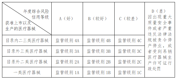 第七條 根據(jù)本市醫(yī)療器械生產(chǎn)企業(yè)獲準(zhǔn)上市以及生產(chǎn)的醫(yī)療器械情形、企業(yè)年度綜合風(fēng)險信用等級,監(jiān)管級別劃分為以下類別。