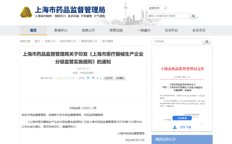 7月21日,上海市藥監(jiān)局發(fā)布《上海市醫(yī)療器械生產(chǎn)企業(yè)分級監(jiān)管實(shí)施細(xì)則》(以下簡稱《實(shí)施細(xì)則》),《實(shí)施細(xì)則》適用于對上海市醫(yī)療器械生產(chǎn)企業(yè)開展的日常監(jiān)督管理活動,所稱生產(chǎn)企業(yè)包括醫(yī)療器械注冊人、備案人以及受托生產(chǎn)企業(yè)。
