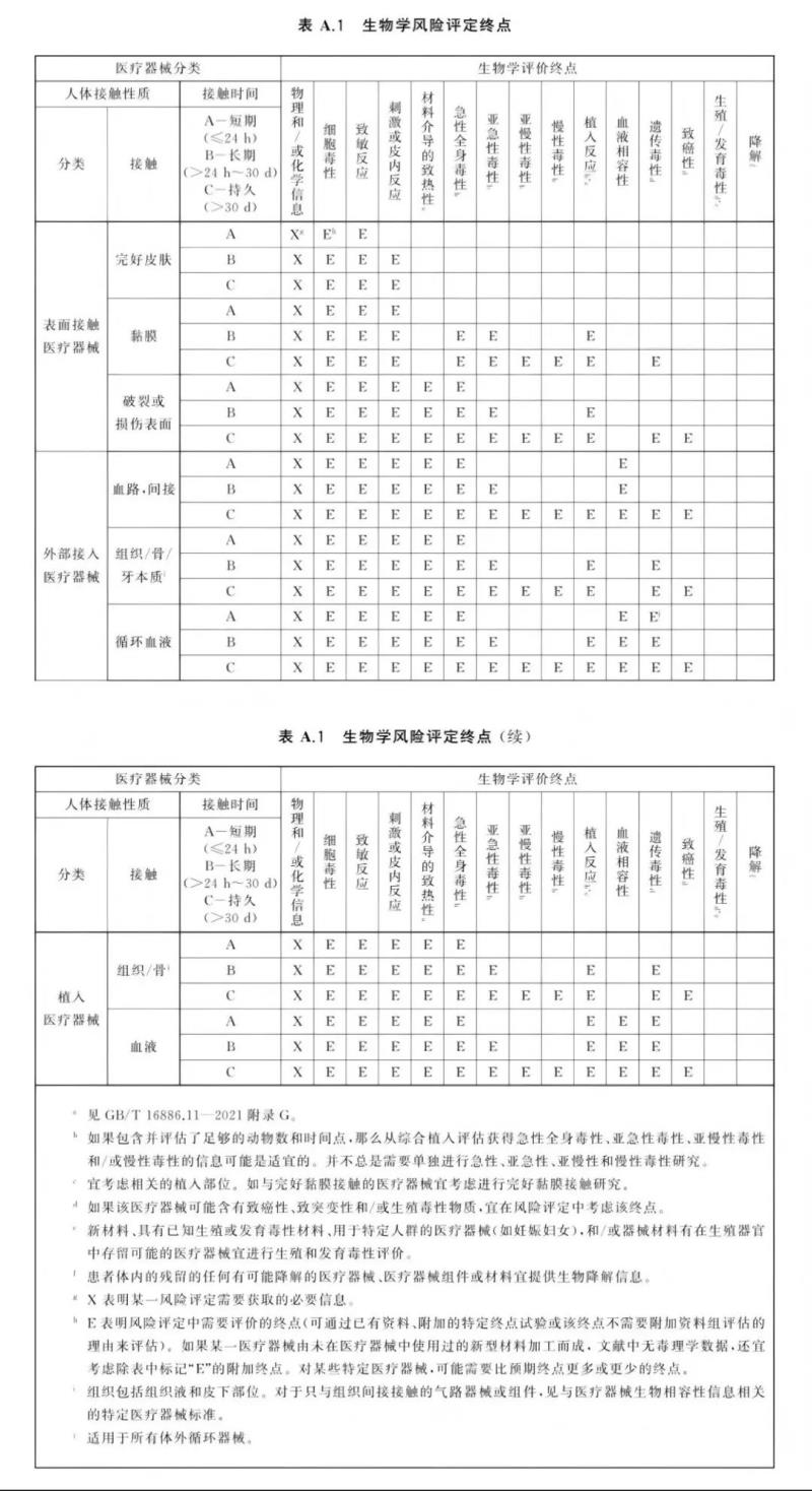 按照上述接觸性質(zhì)和接觸時(shí)間2個(gè)分類原則確定了醫(yī)療器械類別之后,再根據(jù)標(biāo)準(zhǔn)GB/T 16886.1-2022的附錄A表A.1給醫(yī)療器械找出相對應(yīng)的生物相容性檢驗(yàn)項(xiàng)目。