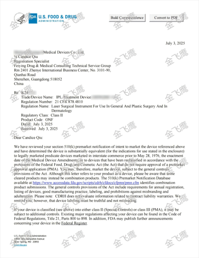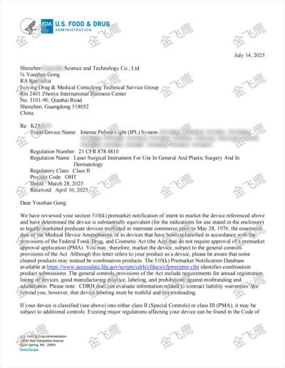 關(guān)注我們的朋友想必已經(jīng)注意到,我們在脫毛儀510(k)注冊領(lǐng)域的成就同樣極為亮眼。由于成功案例實(shí)在太多,很多新取得的K號甚至都來不及一一宣傳。值此機(jī)會,我們特別精選兩張今年7月新出的K號與大家分享,更多脫毛儀510(k)成功案例,歡迎點(diǎn)擊右側(cè)鏈接查看?IPL脫毛儀510(k)。