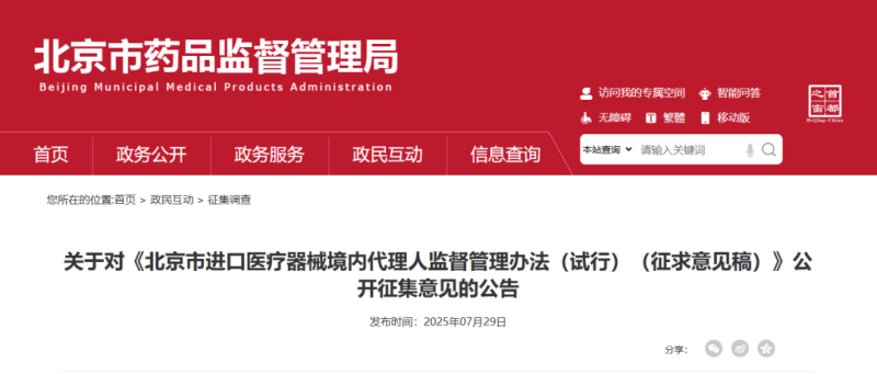 7月29日,北京市藥監(jiān)局發(fā)布《北京市進(jìn)口醫(yī)療器械境內(nèi)代理人監(jiān)督管理辦法(試行)(征求意見稿)》(以下簡(jiǎn)稱《辦法》),并向社會(huì)公開征求意見。公開征集意見時(shí)間為:2025年7月29日至8月29日。