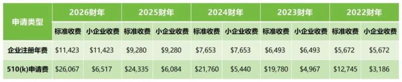 具體來說,企業(yè)注冊年費漲至$11423,相比2025財年的$9280上漲了$2143,漲幅23.1%;相比而言,510(k)申請費的漲幅則要稍小一些:其中510(k)申請標準收費漲至$26067,小企業(yè)的510(k)申請費則為6517美元,漲幅均為7.1%。