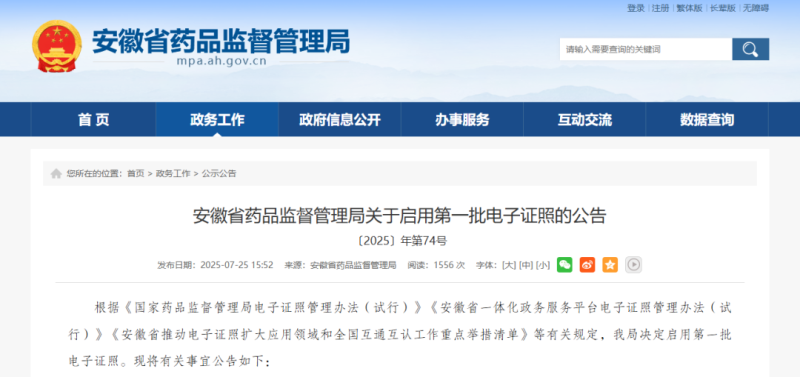 電子證照同步在安徽省藥品監(jiān)督管理局門戶網(wǎng)站電子證照公示欄目(https://mpa.ah.gov.cn)公示。該公告同時提到,電子證照啟用前該局已頒發(fā)的相關(guān)紙質(zhì)證書(含正本、副本、附頁和變更記錄頁),在有效期內(nèi)繼續(xù)使用。