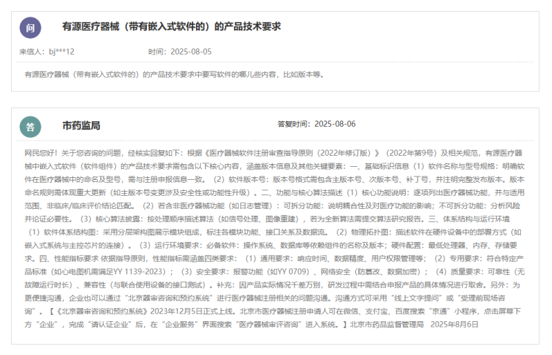 根據(jù)北京市藥監(jiān)局的答復(fù),根據(jù)《醫(yī)療器械軟件注冊審查指導原則(2022年修訂版)》及相關(guān)規(guī)范,有源醫(yī)療器械中嵌入式軟件(軟件組件)的產(chǎn)品技術(shù)要求需包含以下核心內(nèi)容,涵蓋版本信息及其他關(guān)鍵要素:
