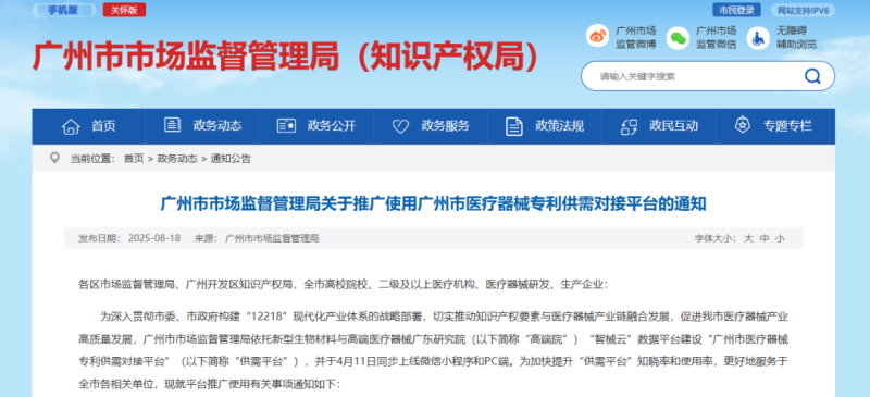 8月18日,廣州市市場(chǎng)監(jiān)督管理局發(fā)布《關(guān)于推廣使用廣州市醫(yī)療器械專(zhuān)利供需對(duì)接平臺(tái)的通知》(以下簡(jiǎn)稱(chēng)《通知》),《通知》提到,該局依托新型生物材料與高端醫(yī)療器械廣東研究院(以下簡(jiǎn)稱(chēng)“高端院”)“智械云”數(shù)據(jù)平臺(tái)建設(shè)“廣州市醫(yī)療器械專(zhuān)利供需對(duì)接平臺(tái)”(以下簡(jiǎn)稱(chēng)“供需平臺(tái)”),并于4月11日同步上線(xiàn)微信小程序和PC端。現(xiàn)就平臺(tái)推廣使用有關(guān)事項(xiàng)通知如下: