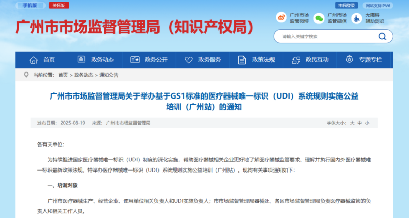 8月19日,廣州市市場監(jiān)督管理局發(fā)布《關于舉辦基于GS1標準的醫(yī)療器械唯一標識(UDI)系統(tǒng)規(guī)則實施公益培訓(廣州站)的通知》,該培訓由廣州市市場監(jiān)督管理局、中國物品編碼中心主辦,廣州市標準化研究院(中國物品編碼中心廣州分中心)承辦,誠邀廣州市醫(yī)療器械生產(chǎn)、經(jīng)營企業(yè)、使用單位相關負責人和UDI實施負責人報名參加。培訓內(nèi)容及報名方式如下: