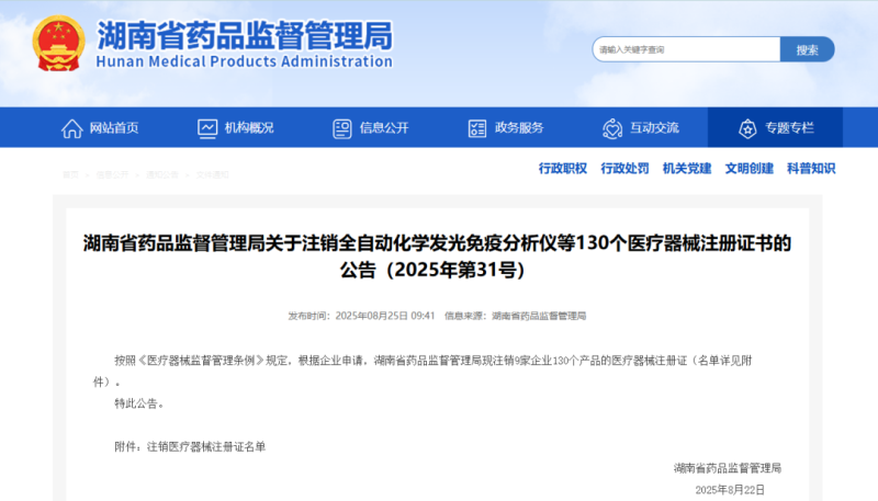 8月25日,湖南省藥監(jiān)局發(fā)布一則醫(yī)療器械注冊(cè)證注銷公告,公告顯示,該局已依法注銷湖南明德醫(yī)療器械有限公司、湖南雷杜生物技術(shù)有限公司、湖南宜樂芯康生物科技有限公司、長(zhǎng)沙市鵬瑞生物科技有限公司等9家企業(yè)共計(jì)130個(gè)產(chǎn)品的醫(yī)療器械注冊(cè)證,以IVD產(chǎn)品居多,其中湖南明德醫(yī)療器械有限公司這一家企業(yè)共注銷了78款產(chǎn)品(含體外診斷設(shè)備及體外診斷試劑),其他企業(yè)注銷的產(chǎn)品包括醫(yī)用紅外耳溫計(jì)、特定電磁波治療器、掌上彩色多普勒超聲顯像儀等,具體明細(xì)如下: