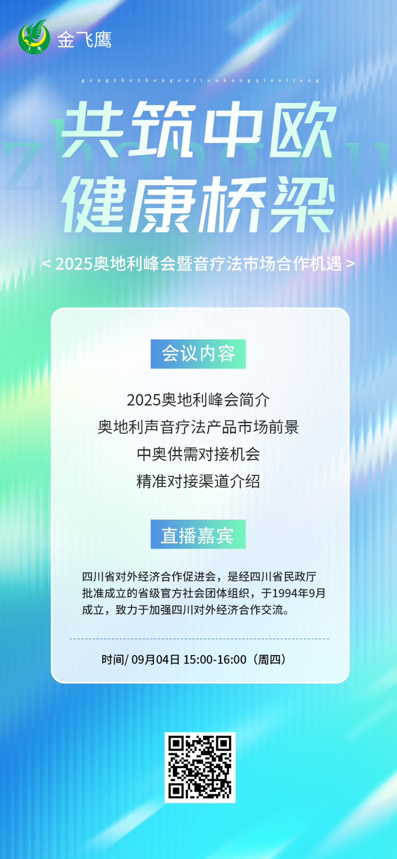 在此背景下,9月4日下午3點(diǎn),我們特別聯(lián)合四川省對(duì)外經(jīng)濟(jì)合作促進(jìn)會(huì),給大家?guī)?lái)第十一屆“全球經(jīng)濟(jì)發(fā)展論壇·奧地利峰會(huì)”暨音療法市場(chǎng)合作機(jī)遇的直播,為您解鎖奧地利市場(chǎng)的財(cái)富密碼!本期直播將從奧地利音療法產(chǎn)品市場(chǎng)前景、中奧供需對(duì)接機(jī)會(huì)及渠道等方面進(jìn)行分享,與各位共拓奧地利的掘金版圖,感興趣的朋友記得提前預(yù)約!