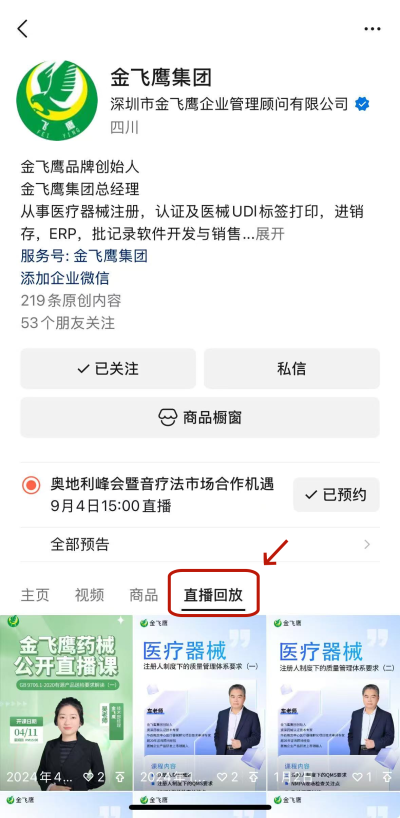 往期直播培訓(xùn)課程支持回放,關(guān)注“金飛鷹藥械咨詢服務(wù)”視頻號(hào)并點(diǎn)擊視頻號(hào)主頁(yè),即可查看“直播回放”哦~