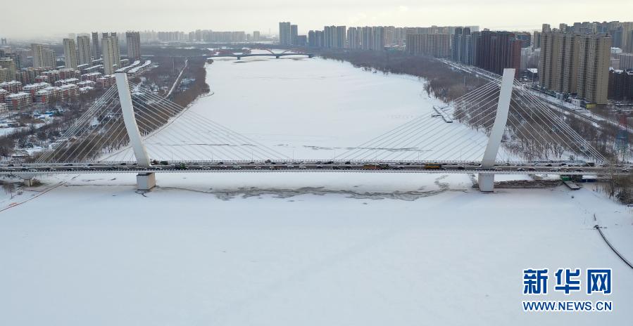 這是降雪后的沈陽(yáng)市富民橋(1月28日攝,無(wú)人機(jī)照片)。