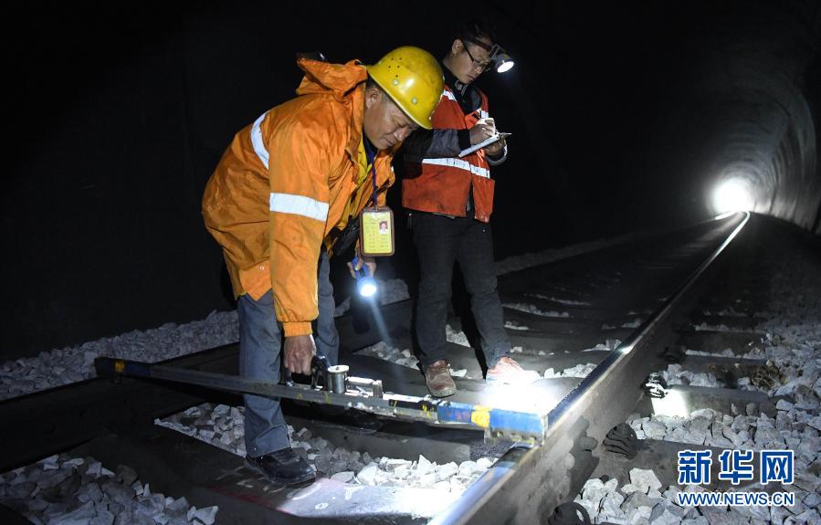 看守工廖成根(左)與工長羅昌偉檢查隧道內(nèi)鋼軌幾何尺寸(1月30日攝)。