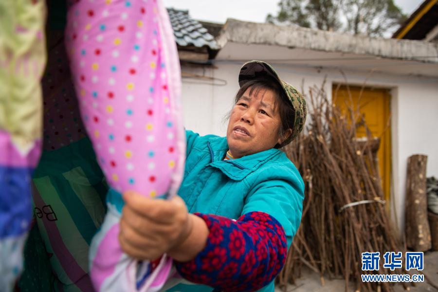 1月29日,在湖南省瀘溪縣浦市鎮(zhèn)麻溪口村,楊玉英在晾曬兒子床上的被褥。