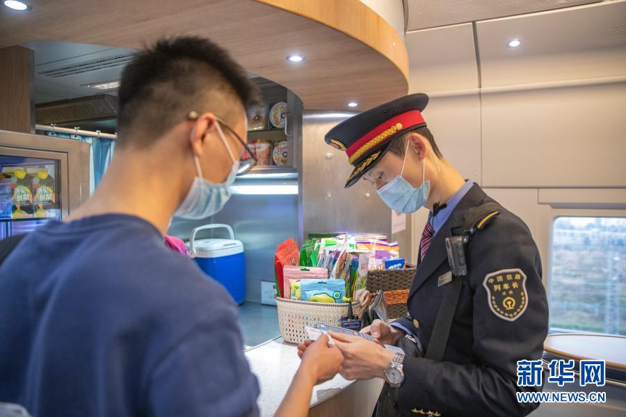 2月9日,在重慶北開(kāi)往萬(wàn)州北的C6422次列車(chē)上,付寶印為一名旅客辦理補(bǔ)票業(yè)務(wù)。新華社記者 黃偉 攝