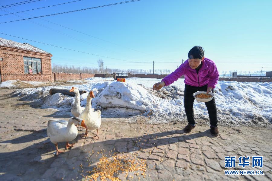2月9日,在吉林省長(zhǎng)春市農(nóng)安縣楊樹(shù)林鄉(xiāng)牛尾巴山村,付寶印的母親鐘士輝在喂鵝。新華社記者 張楠 攝