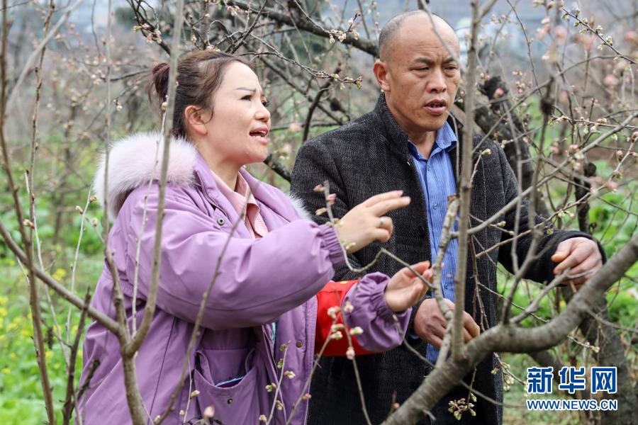 2月13日,吳窮(左)在坪子社區(qū)和種植大戶檢查櫻桃樹的生長情況。新華社記者 歐東衢攝
