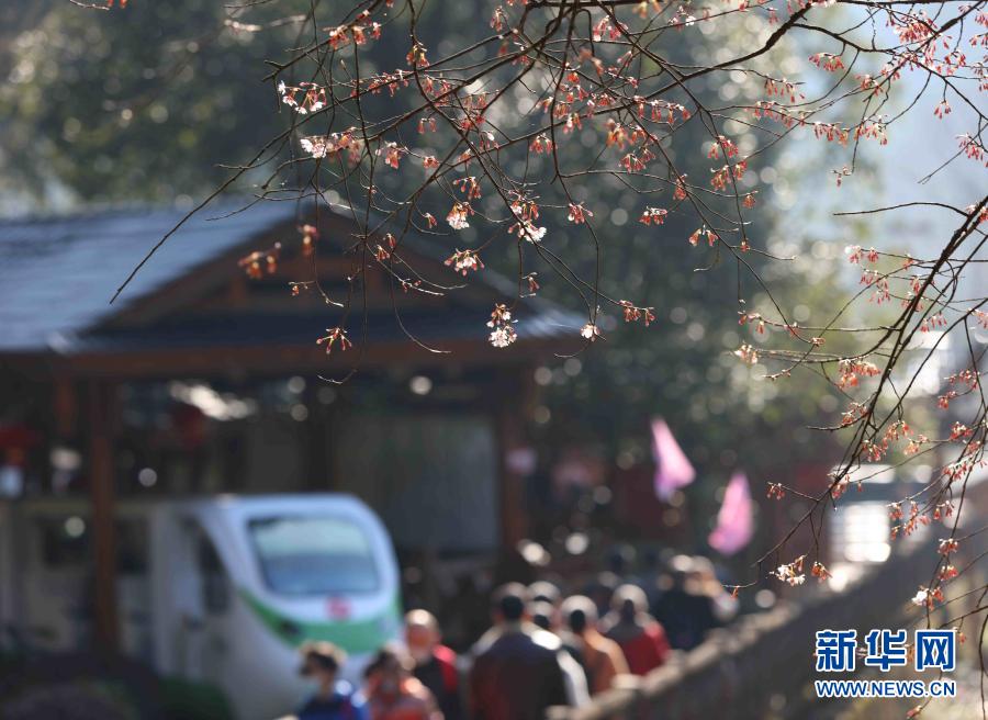 2月14日,游客在湖南張家界武陵源景區(qū)十里畫廊觀賞櫻花。新華社發(fā)(吳勇兵 攝)