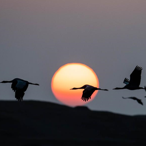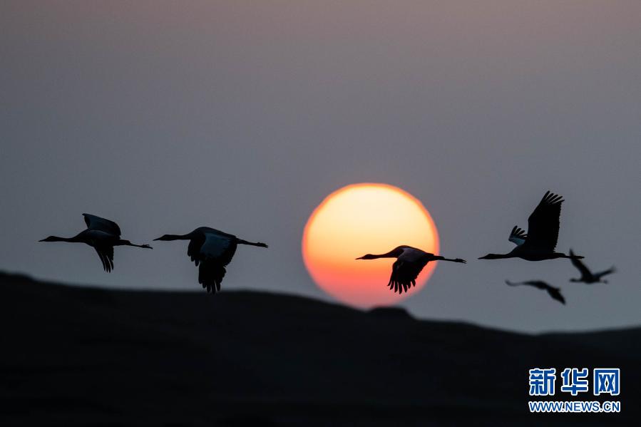 日出時分,黑頸鶴在大山包黑頸鶴國家級自然保護(hù)區(qū)飛翔(2月27日攝)。